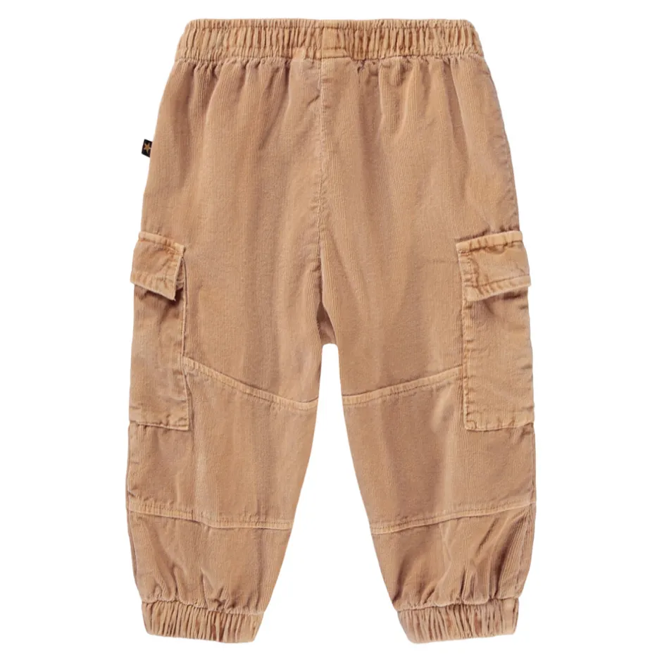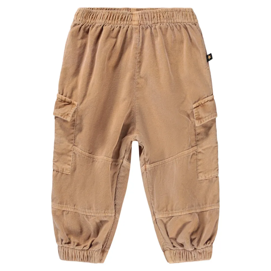 Cargobukser i blød, økologisk bomuldsfløjl med en afslappet pasform. Bukserne har rummelige cargolommer på lårene, elastisk talje og elastiske afslutninger ved anklerne for ekstra komfort og bevægelsesfrihed.