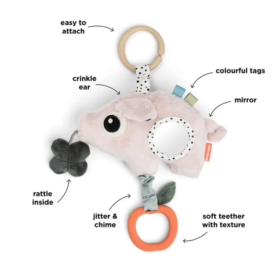 Stimulerende og sjovt legetøj til din baby, der fremmer udviklingen. Med elementer som en rangle, et klokkespil og knitren vil dit barns hørelse og taktile sans blive stimuleret. Lad din baby opdage sig selv i spejlet og aktivere rystefunktionen ved at trække i den æbleformede bidering.