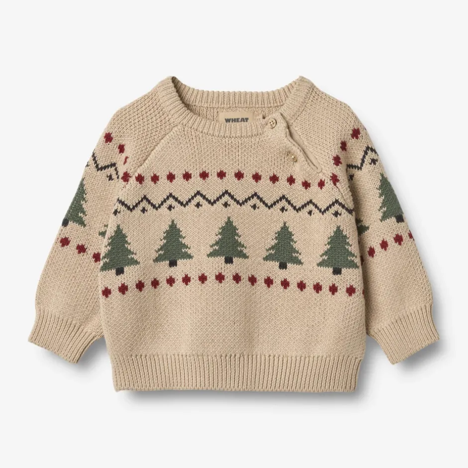 Skøn strikpullover med julemotiver i blødt økologisk bomuld til baby. Wheats strik er et must, når vinterkulden nærmer sig. Denne strikpullover oser af julens nærvær med sit fine print med julemotiver. Perfekt til både bukser og kjole, uanset om det er til en julefest eller hygge hjemme i weekenden. Brug den som et ekstra lag under jakken, så dit barn kan være lunt pakket ind hele sæsonen.