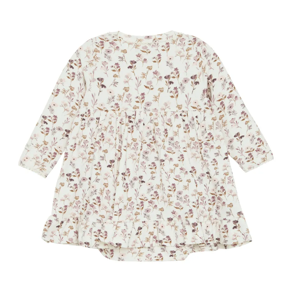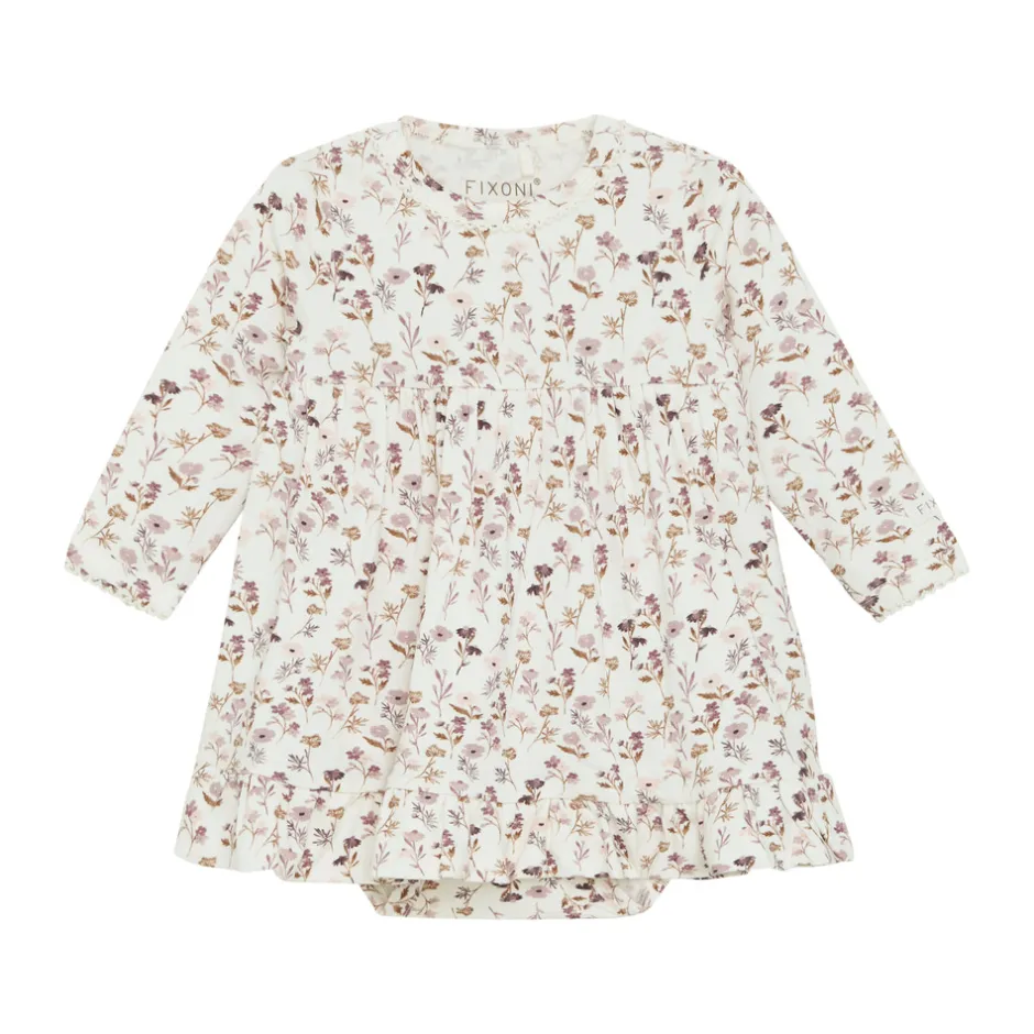 Sød bodykjole med all-over-print fra FIXONI. Kjolen har et rynket skørt omkring taljen, lange ærmer og lukkes nemt med trykknapper ved skulderen og mellem benene – både praktisk og yndig.