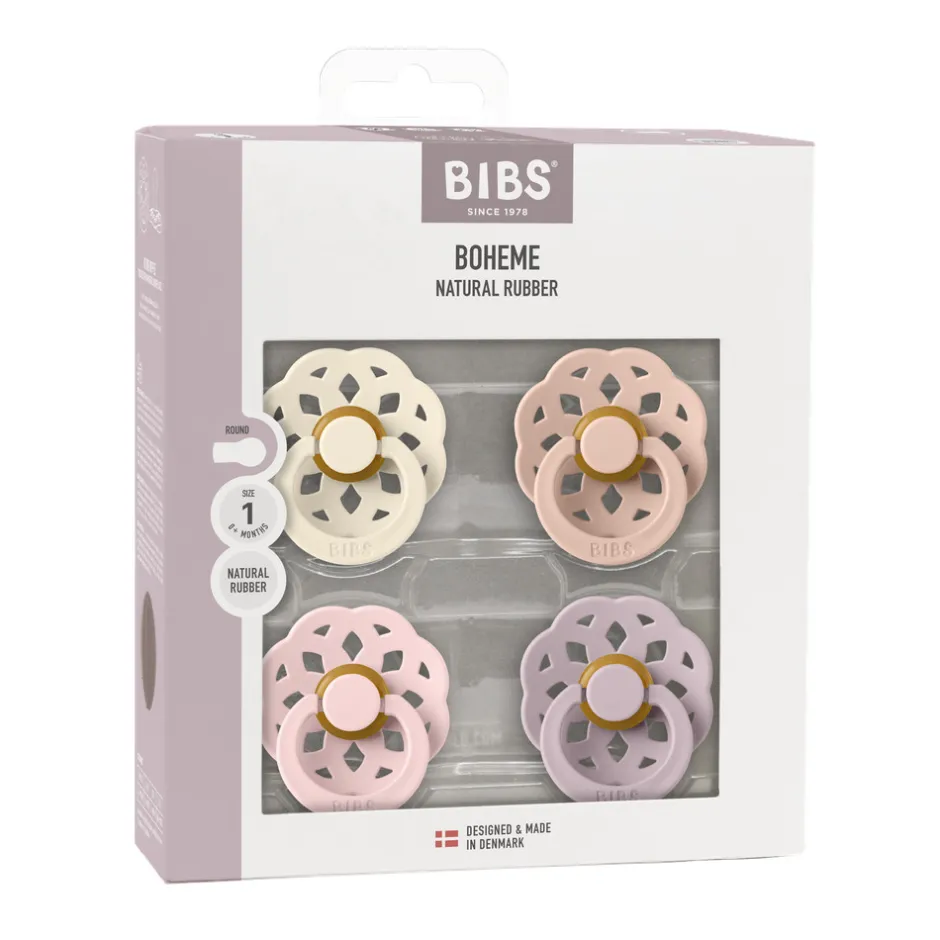 BIBS Boheme-sutten har en romantisk og kunstnerisk silhuet, der er inspireret af naturen. Det runde sutte hoved fremmer en lignende tunge placering og suge teknik som ved amning. Sutten er udstyret med en ventil, der slipper luft ud, når barnet lukker sutten. Dette ventilationssystem får luften inde fra sutten til at blive skubbet ud gennem ventilen og derved flade sutten ud for at forme sig naturligt efter babyens mundhule. Ventilen er også grunden til, at vand kan komme ind i sutten efter rengøring og sterilisering – hvis dette er tilfældet, skal du bare klemme sutten flad for at presse det overskydende vand ud. Det runde lette skjold vender væk fra barnets følsomme og sarte hud omkring munden for at sikre minimal kontakt med næse og mund, hvilket betyder mindre chance for fugtophobning fra spyt, der kan forårsage udslæt og ømme pletter.