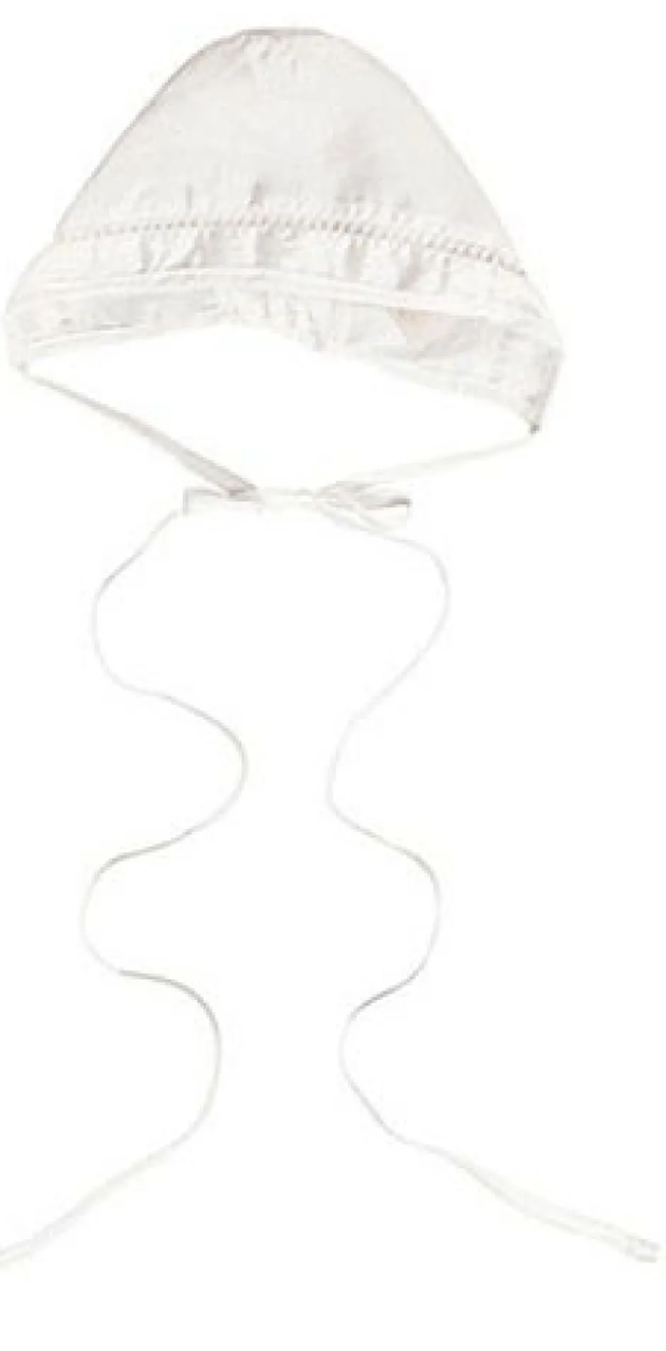 Enkelt fin elfenbensfarvet dåbshat i imiteret silke som giver hatten struktur som råsilke. Hatten har en hul-blonde som matcher med råhvid dåbskjole fra Jocko. Der er lille elastik i bagkanten.
