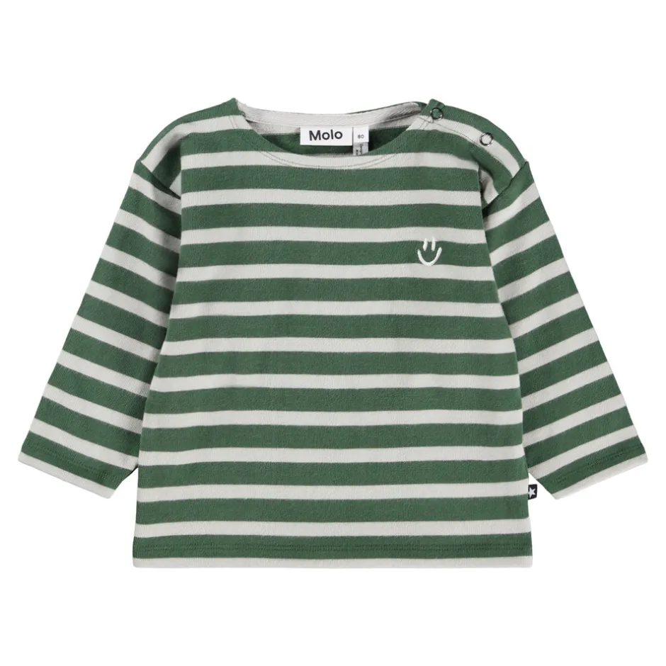 Blød, langærmet bluse i økologisk bomuldsjersey med afslappet pasform. Ved brystet er der broderet et lille, hvidt smilende ansigt, som tilføjer et legende udtryk. Blusen har rund hals og praktisk knaplukning på venstre skulder.