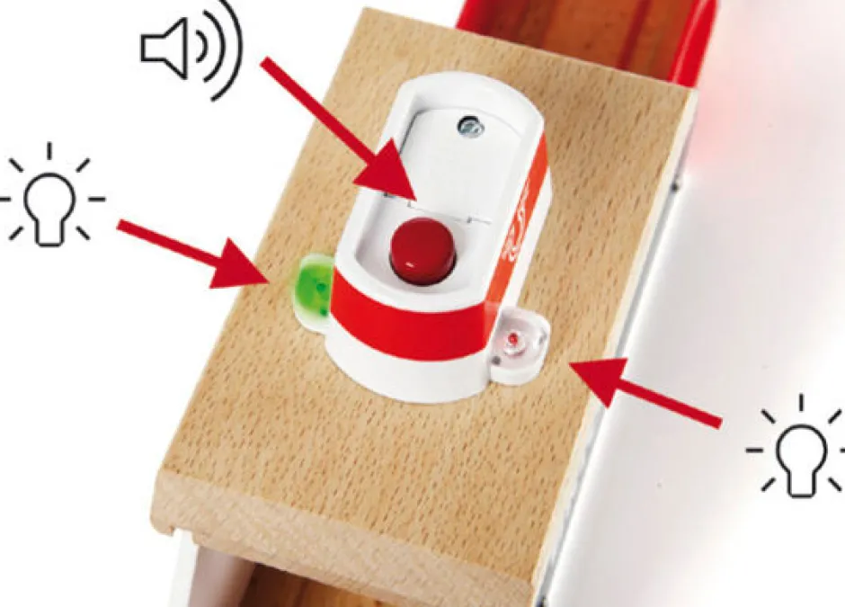 Få dit tog sikkert over vandet med denne togfærge. Lys og lyd aktiveres ved at trykke på knappen. De to havnespor sørger for at færgen åbner bovportene, når den ankommer til havnen. I alt 3 dele. Bruger 2 strk. LR44 batterier (incl.)