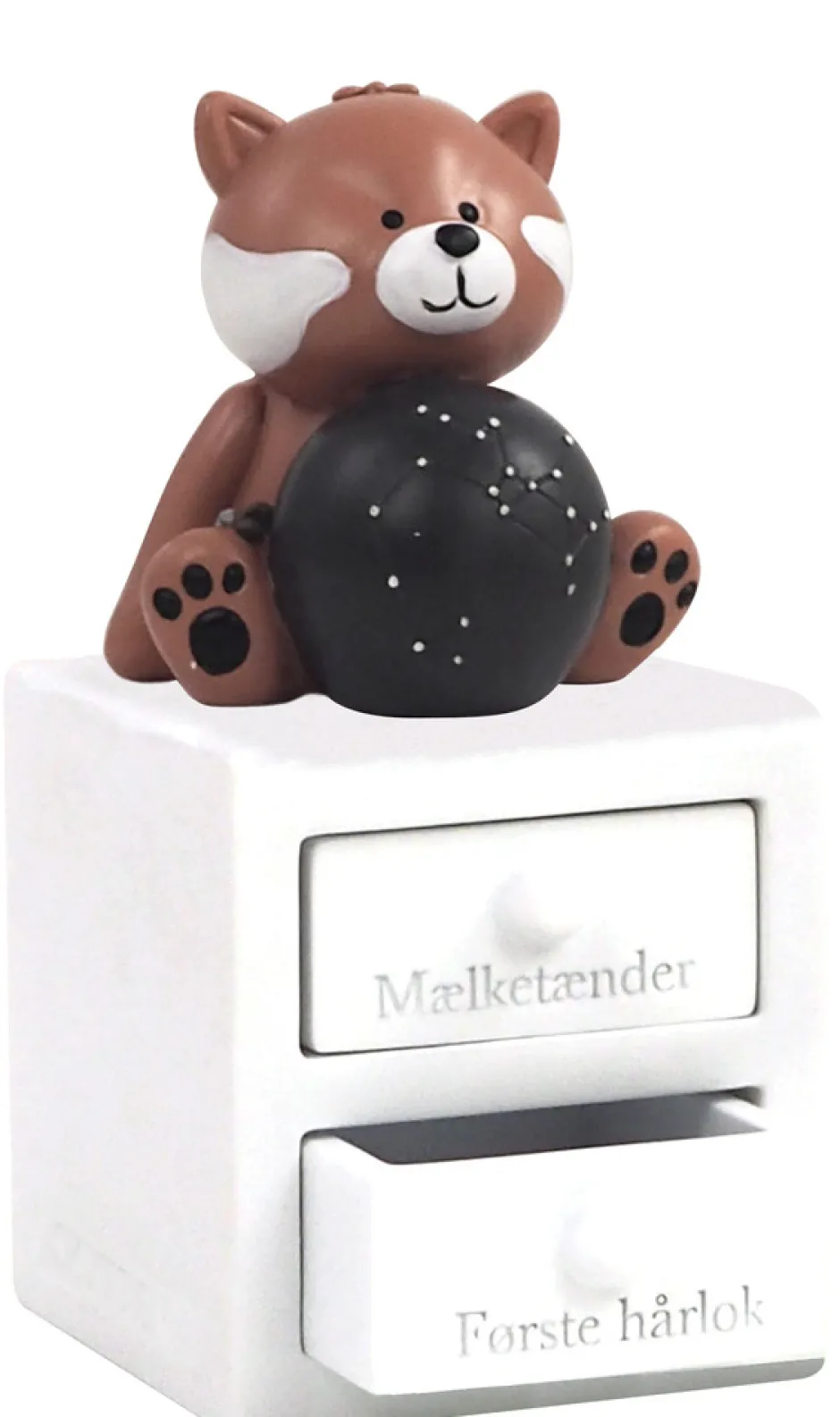 Første tand og hårlok æske med skytten stjernetegn, med planet og stjernebillede, som lyser i mørket. Figuren har to skuffer – En til første tand og en til hårlok. Super fin dåbsgave ide. Æsken er håndmalet så der kan være variationer.