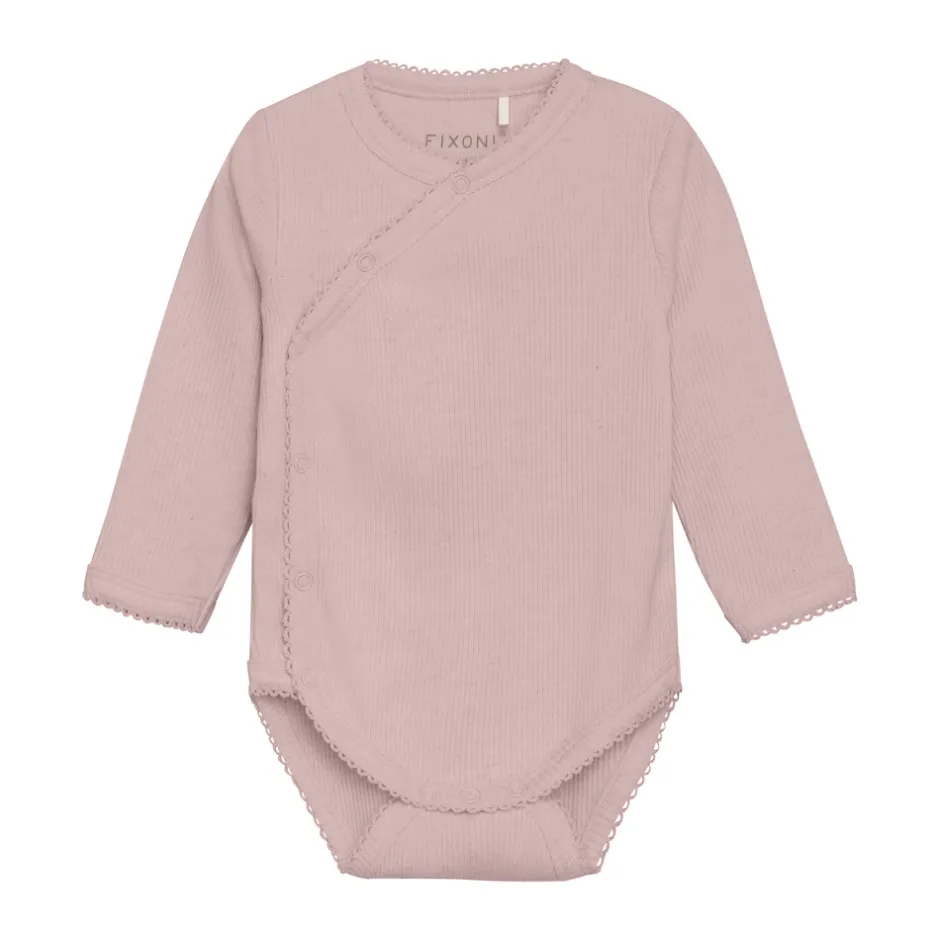 Langærmet slå-om-body fra FIXONI i ensfarvet mélange-kvalitet. Bodyen er fremstillet i en blød og behagelig kvalitet og lukkes nemt med trykknapper foran og mellem benene – praktisk ved både påklædning og bleskift.