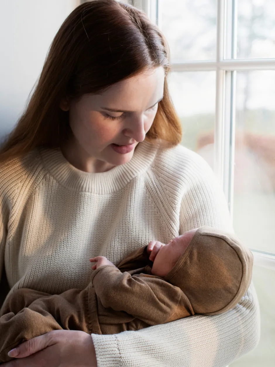 Slå-om body med trykknapper til baby første tid. Syet af blød økologisk bomulds rib.