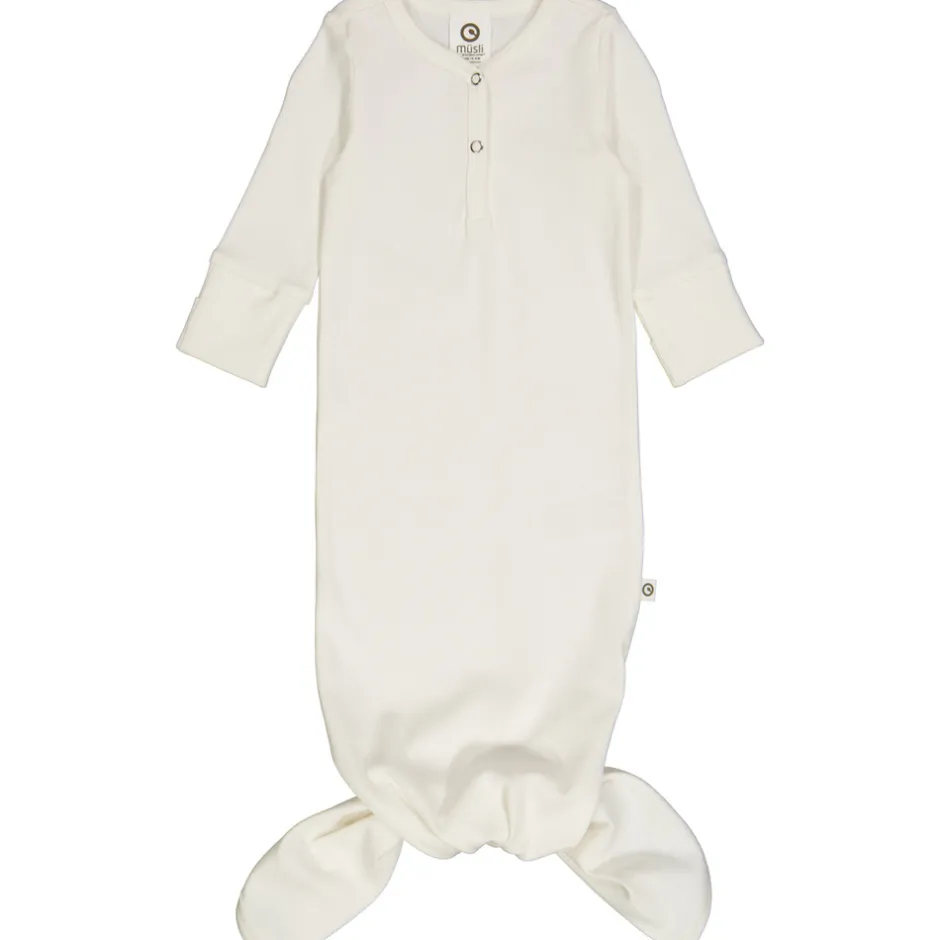 Skøn og blød ribbet soveposedragt med knude lukning i bunden Knuden ved den lilles fødder gør det nemt med hyppige bleskift. Specielt smart om natten hvor man ikke vil vække baby mere end højest nødvendigt. Der er ydermere vendbare hænder, så man kan holde babys hænder inde i dragten. Brug den til at give ekstra tryghed, som sovepose en varm sommerdag, eller hvor den passer ind for jer. Den tilpasser sig barnet, og giver en omsvøbende effekt. Ribstrikken giver en dejlig elastisk fornemmelse, der smyger sig om baby og holder formen. Fremstillet i bomulds-rib med elastan for bedst mulig pasform og komfort. (GOTS Organic Certified by Ecocert Greenlife Lic. No. 152033). Produktet er GOTS organic- certificeret, hvilket betyder at bomulden er certificeret økologisk, og at der i alle andre processer som farvning, strikning og syning er taget de strengeste hensyn til miljøet. GOTS er internationalt anerkendt som den førende standard for forarbejdning af tekstiler af økologisk bomuld. Derudover tages der også hensyn til arbejdsforholdene, hos dem der producerer tøjet. Økologisk bomuld 95%, Elastan 5%