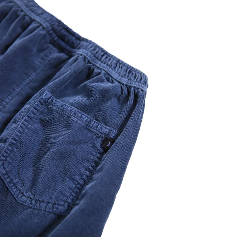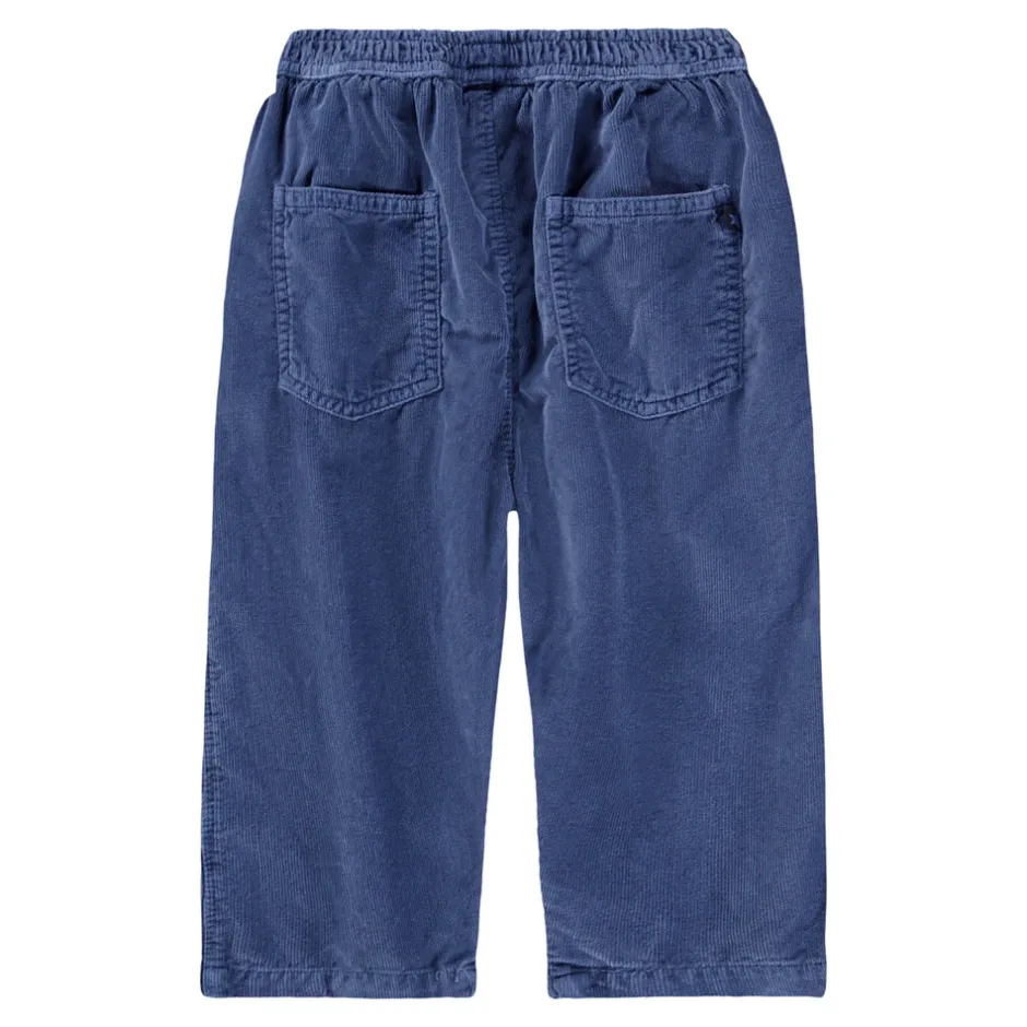 Bløde fløjlsbukser i økologisk bomuld med en afslappet pasform. Bukserne har både for- og baglommer samt en komfortabel, elastisk talje. Et lille broderet smilende ansigt ved lommen tilføjer et legende præg.