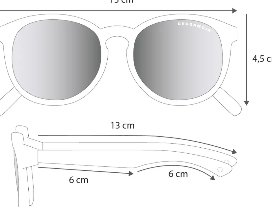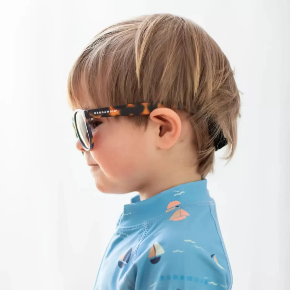 Seje brune solbriller fra Geggamoja. Bløde og fleksible i silikone, så de kan holde til børns uforsigtige behandling. Elastikbånd til at sætte rundt om hovedet, så de sidder på plads. Elastikbåndet kan tages af ved hjælp af spænder i enderne af brillestængerne og kan justeres for perfekt pasform.