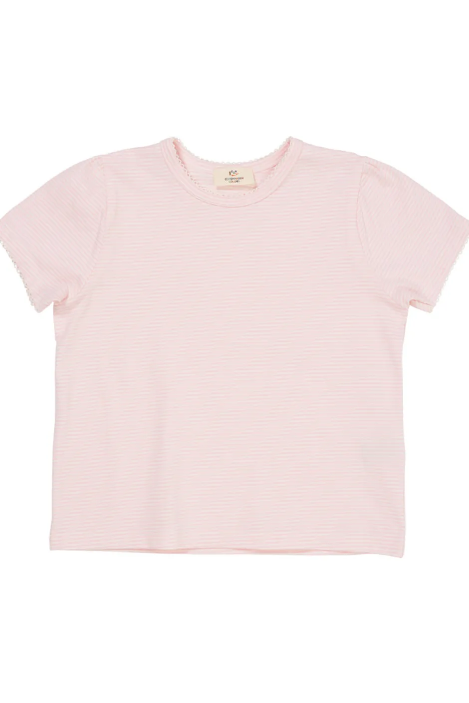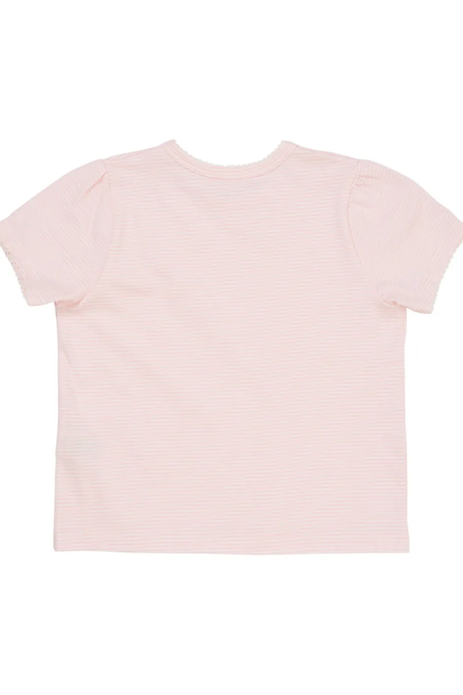 Giv dit barns garderobe et friskt og sødt pift med den stribede t-shirt med flæseærmer.