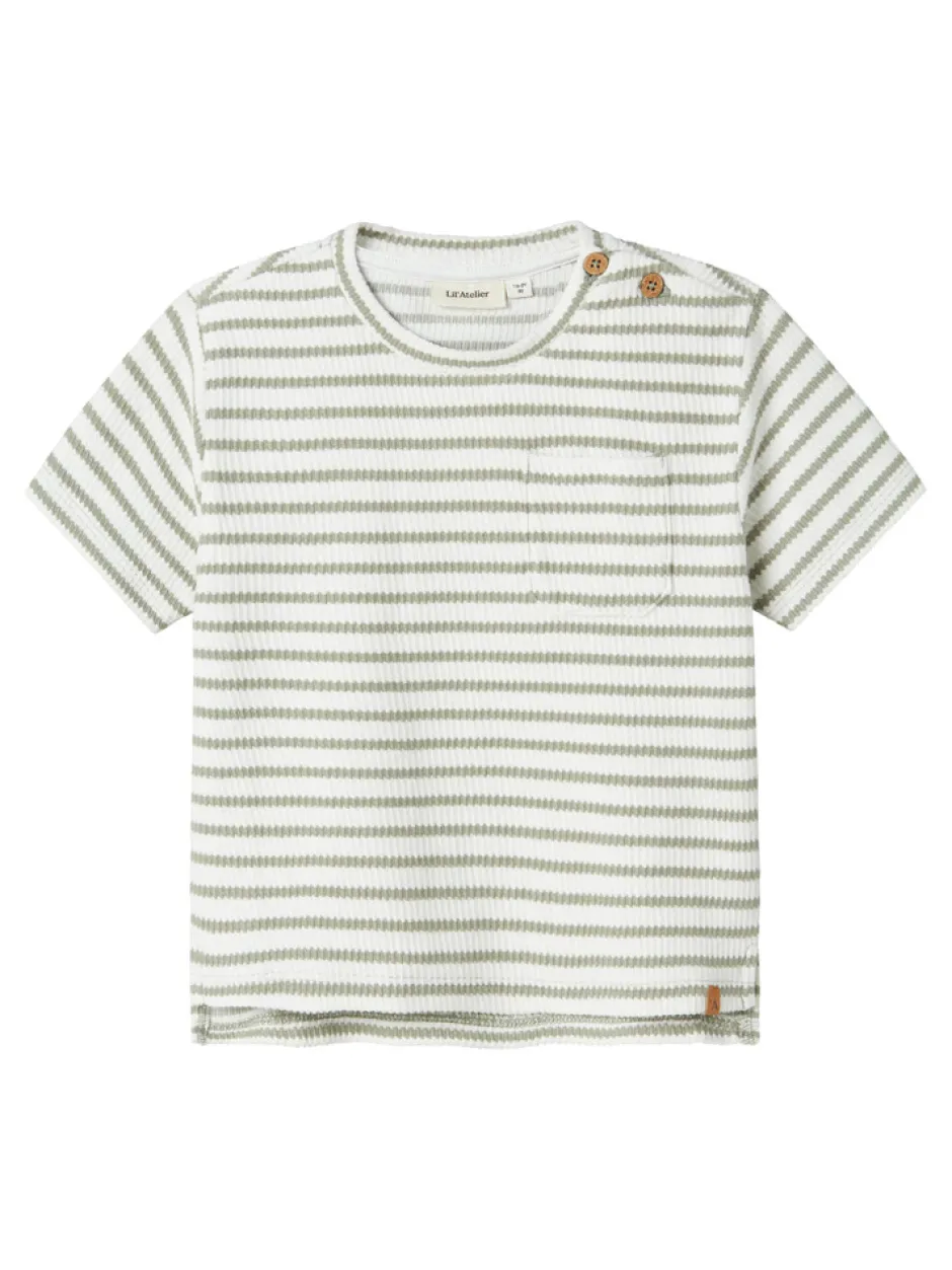 Giv din dreng et cool og praktisk look med denne t-shirt med brystlomme og knap i træ look ved skulderen. Perfekt til både leg og hverdag, denne t-shirt kombinerer funktionalitet og stil.