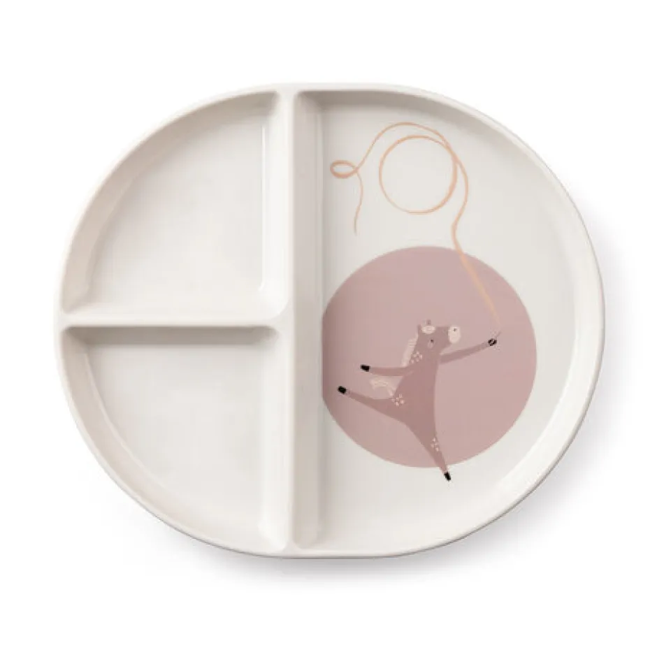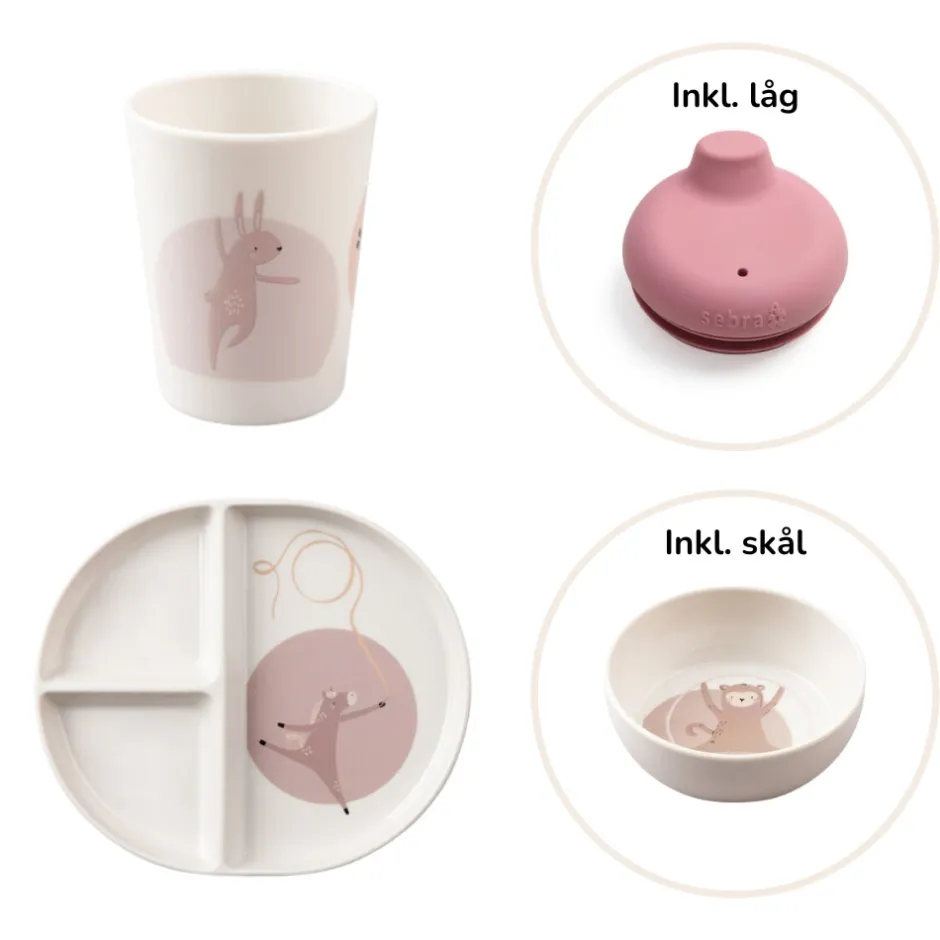 Pakken består af tallerken m/3 rum, skål, kop og låg!
