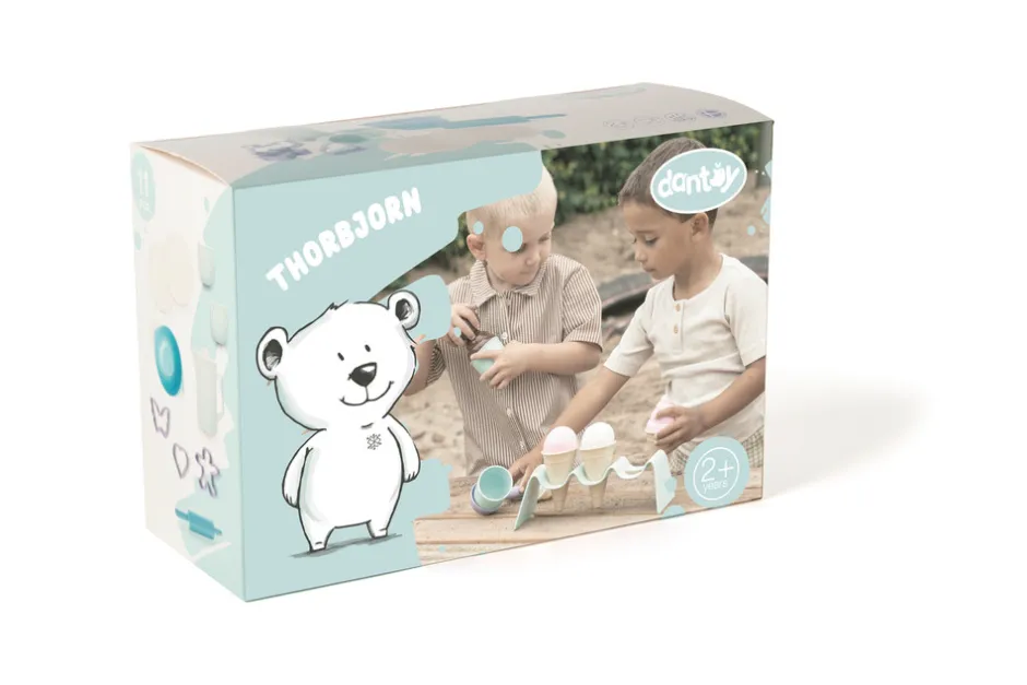 Thorbjørn sæt med isvafler og diverse toppings, som forestiller forskellige iskugler i forskellige smage. I sætter kommer der også en opsats, hvor børnene kan stille isvaflerne i ligesom i en rigtig isbutik.