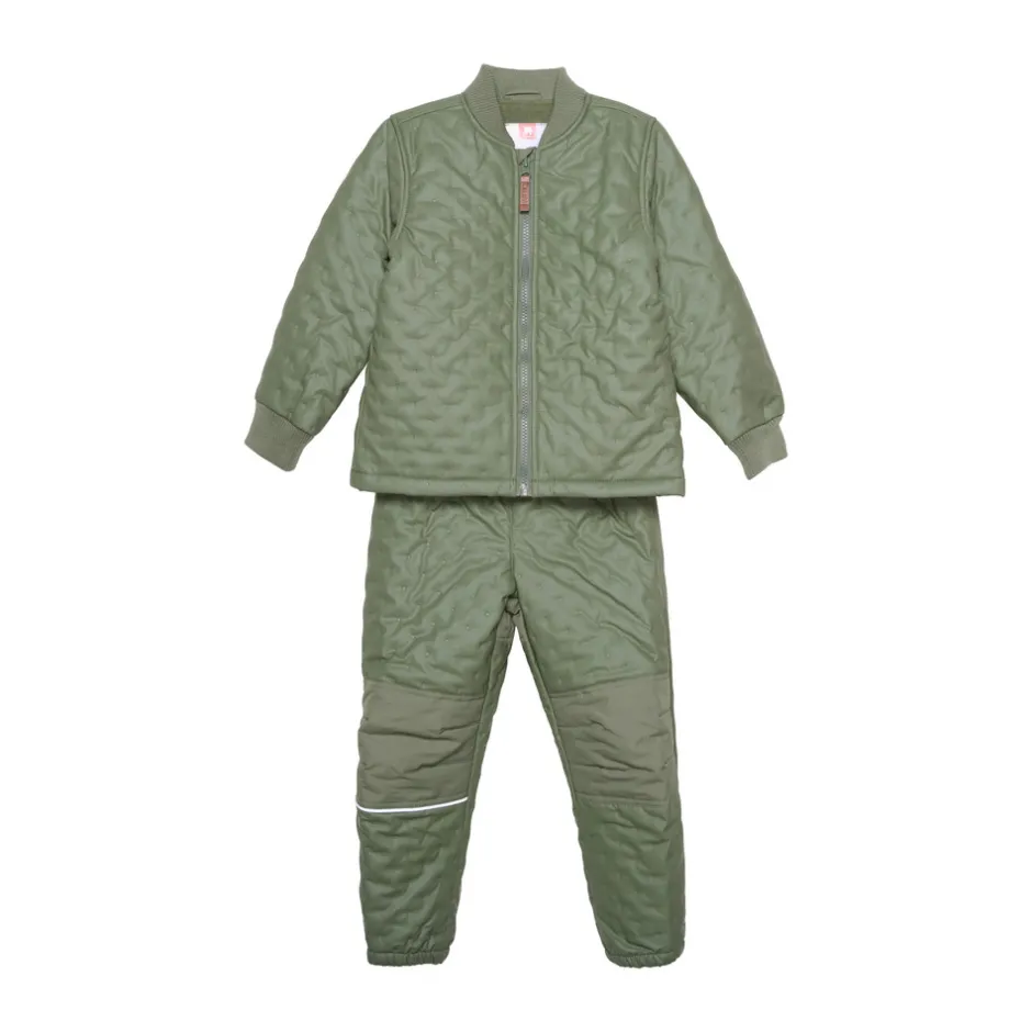 Termotøj med PU-belægning, som gør termotøjet vandtæt. Derudover er sættet foret indvendigt. Ekstra forstærket på knæ og bagpå på bukserne. Bukserne har desuden elastik i talje og ved ankler. Jakken har ribkant ved hals og håndled samt lynlåslukning. CeLaVi-logo foran.