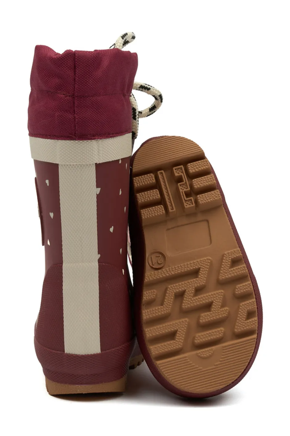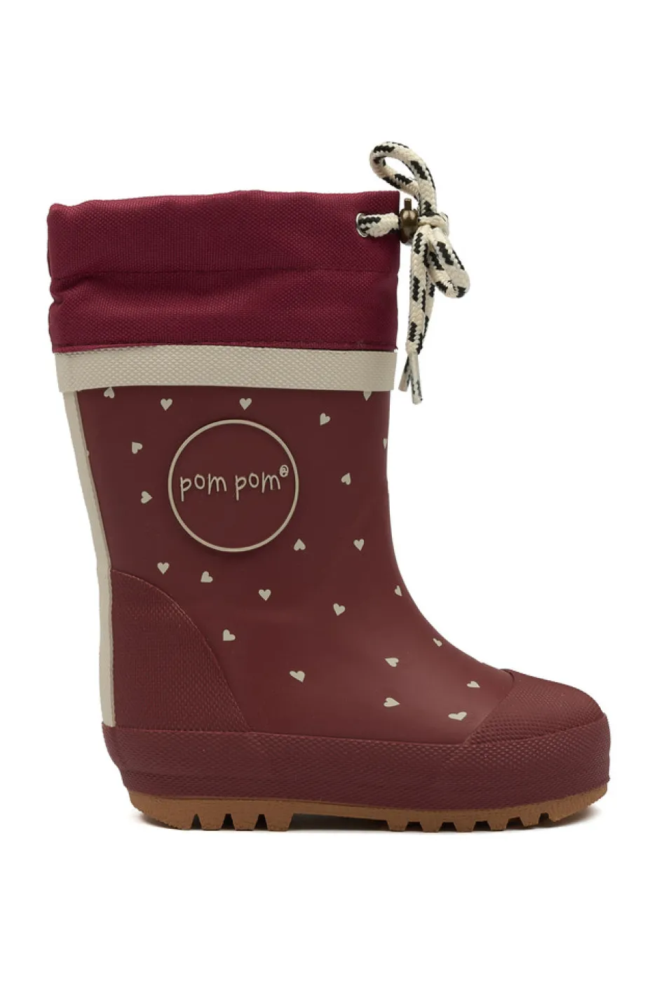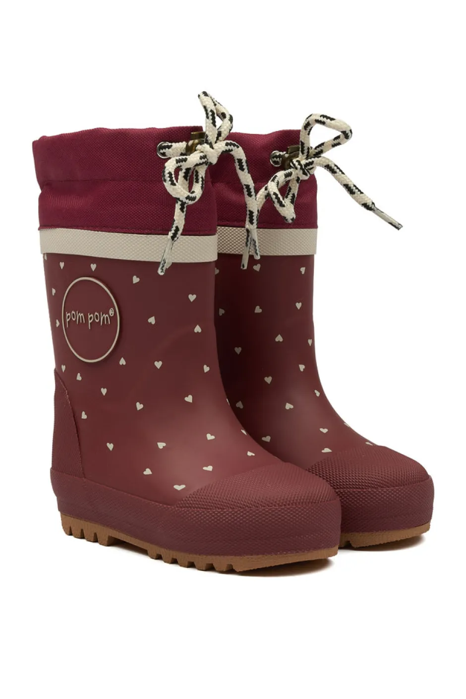 Pom Pom® GumBoots™ Thermo er en smuk gummistøvle i naturgummi med et mat look og logo på siderne. Støvlen er højere og har en bred tekstilkant øverst. Tekstilet kan strammes med en fin snor og en metalstopper. Indersiden er foret med blød uld, og bunden har en aftagelig sål. Støvlen er blød og fleksibel, og sålen har et ribbet mønster, der giver godt fodfæste.
