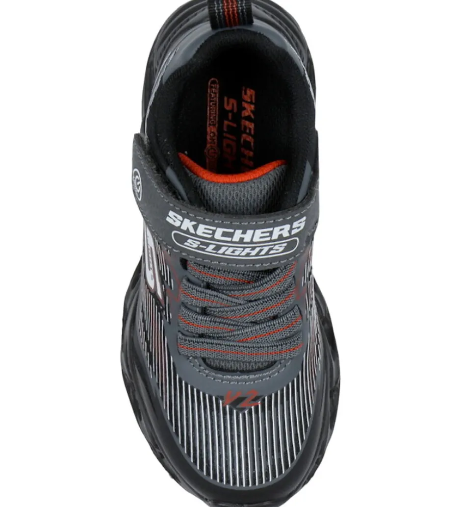 Smarte Skechers-skor i svart och mörkgrått med smala ränder i vitt och rött och ett logotryck på utsidan samt på kardborrebandet. Skorna har inbyggd LED-ljud i yttersulorna som aktiveras när barnet går och springer. Ljuset kan tändas och släckas med en knapp på kardborrebandet.