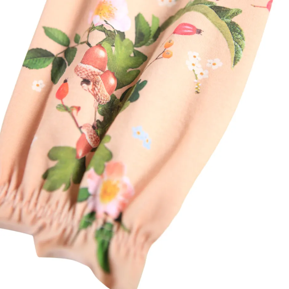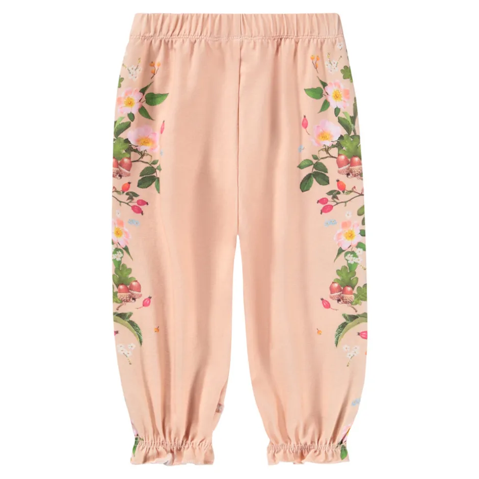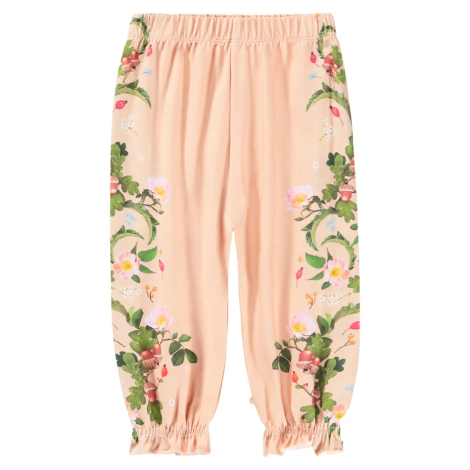 Bukser i blød, økologisk bomuldsjersey med elastik i taljen og ved anklerne, som danner en sød lille flæsekant.