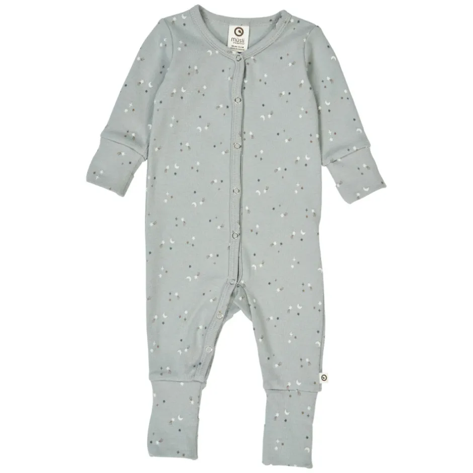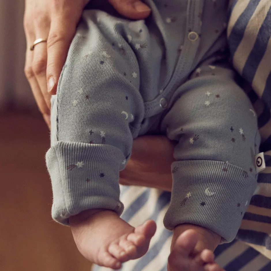 Skøn heldragt i blød blød rib kvalitet. Smukt gennemgående print af stjerner. Heldragten lukkes fortil med tryklåse og har vendbare fødder og hænder. Dragten er perfekt til de små for at sikre at de ligger lunt og trygt. De vendbare fødder og hænder kan foldes efter behov.