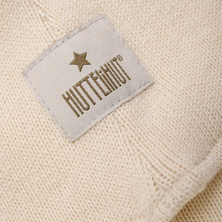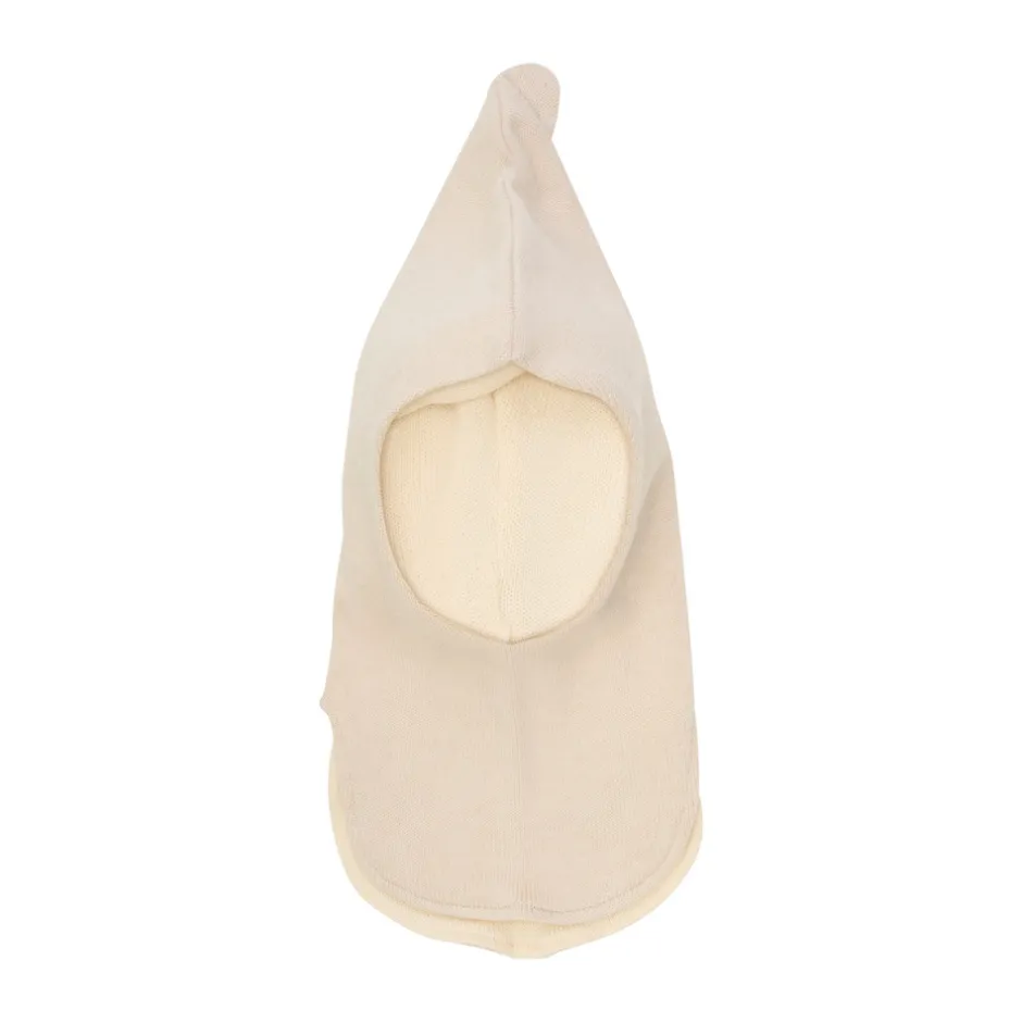 Blød HUTTEliHUT elefanthue i to lag. HUTTEliHUT elefanthuen har en spids hovedform, og en rund ansigtsåbningen. Huen har et ekstra lag ved ørene, som beskytter mod vinden og har et praktisk splitdesign i bunden med ekstra længde bagpå. Elefanthuen er strikket i Merino uld, med et blødt strikket bomulds foer.